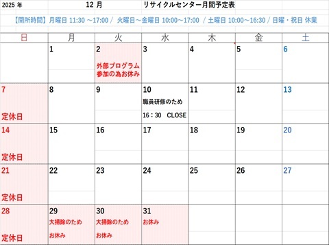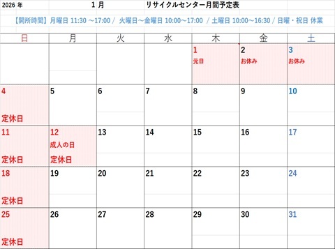 リサイクルセンターすとぉりぃの2026年度1月分カレンダーを掲載します。