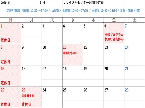 リサイクルセンターすとぉりぃの2月カレンダーを掲載します。今年もまだ始まったばかりと思っていても、季節のイベントは次々やってきます。気持ちよく乗りこなしていきたいですね。すとぉりぃでも可愛いひな人形が皆様をお待ちしております。お雛様、お内裏様に是非会いに来てください!